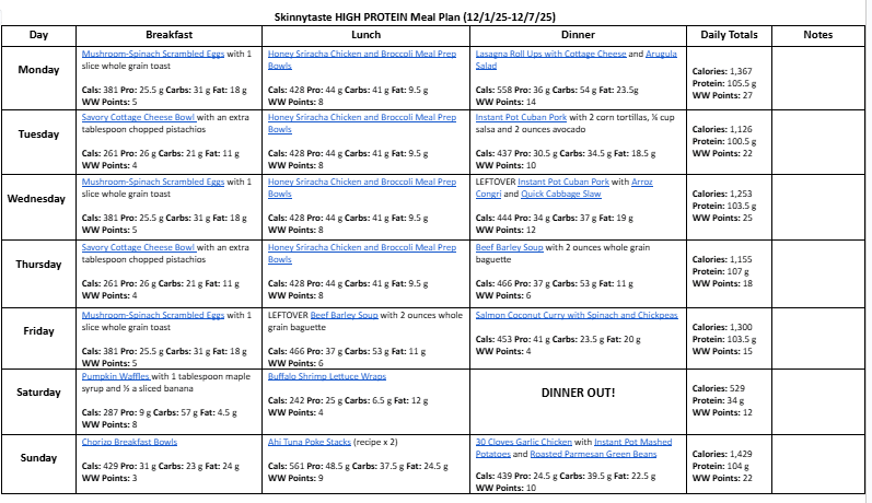 A free, 7-day high protein diet meal plan including breakfast, lunch and dinner ideas and a shopping list. All recipes include macros and Weight Watchers points.