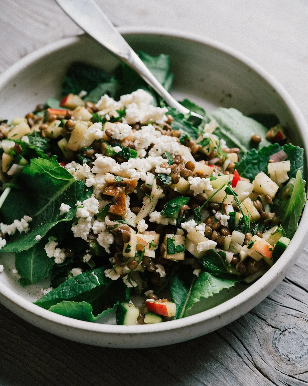 In the bottom of your mixing bowl, combine all of the vinaigrette ingredients and stir to mix. Add the cooled lentils, all your chopped vegetables, walnuts and herbs. Toss to coat. Chill in the fridge for an hour if possible for flavors to marry. Not imperative if you don’t have the time.