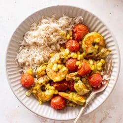 This summer sheet pan shrimp is made with my cilantro lime dressing, burst cherry tomatoes and sweet corn. It’s a refreshing spin on the usual cozy sheet pan meal and served over jasmine rice? It’s lovely!