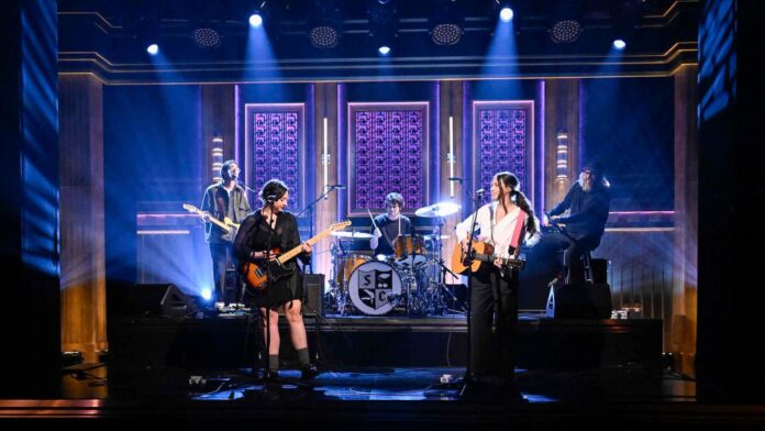 Snocaps performed on The Tonight Show Starring Jimmy Fallon last night (November 18), marking their late-night debut and first show ever. Katie and Allison Crutchfield christened their new indie-rock project with a live rendition of “Coast,” from their self-titled debut album. Joining them onstage were MJ Lenderman on drums, Brad Cook on bass, and Colin Croom on guitar. Watch a replay of the performance below.